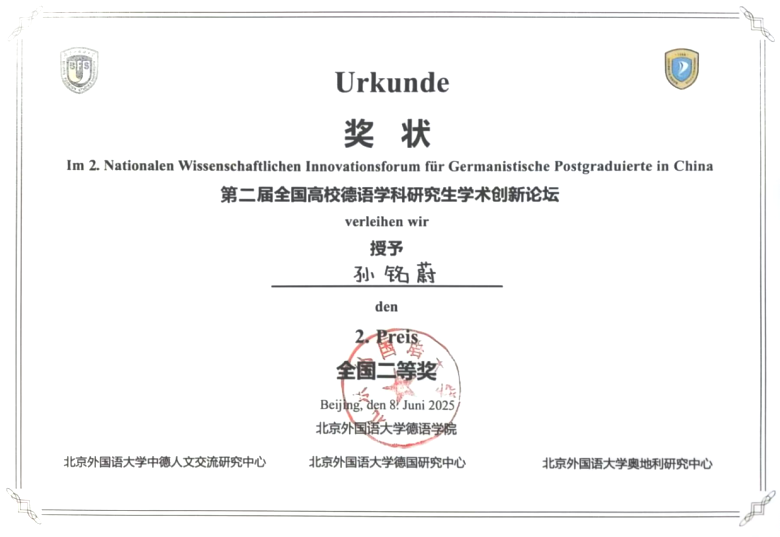本次论坛由北外德语学院主办,北外中德人文交流研究中心、德国研究中心、奥地利研究中心协办,北外研究生院、外研社综合语种教育出版分社德语部及北外荣裕民基金支持。论坛秉持“求知·求新·求真”的宗旨,设立“文学与翻译”“语言与跨文化”“区域与国别”三个学术赛道,为全国德语学子搭建跨学科研究与学术交流平台,以扩展学术视野、促进学术创新。经过初赛匿名评审,全国共有28名学生晋级决赛,我系孙铭蔚成功入围总决赛并赴北京外国语大学参加总决赛,最终凭借论文《<彭忒西勒亚>中的语言失效与主体性危机》获得“文学与翻译”赛道全国二等奖。