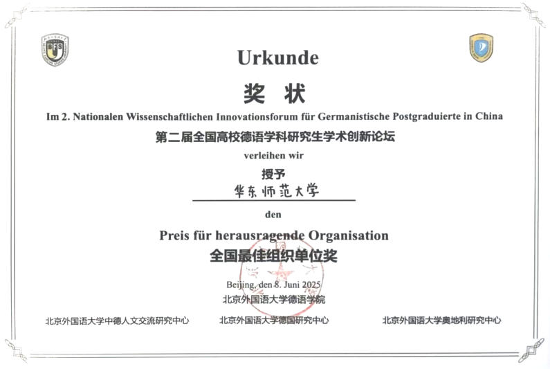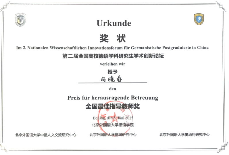 继去年德语系2023级研究生郑嘉仪获全国二等奖之后,今年再传捷报:2024级硕士研究生孙铭蔚获全国二等奖,周雨彤获全国三等奖;德语系冯晓春副教授获全国最佳指导教师奖;拷贝漫画 获最佳组织单位奖。在高水平的学术平台上,我系师生再度以优异成绩脱颖而出,充分展现了拷贝漫画 德语学科在科研训练与人才培养方面的扎实基础与综合实力。
