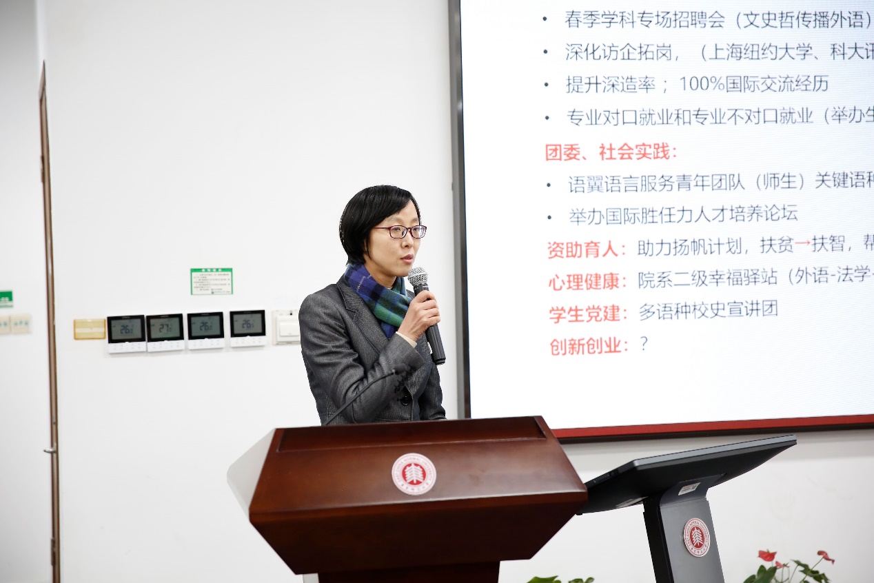 党委副书记兼副院长江宇靖通报了学生、双创、宣传工作计划,希望老师们积极关心学生的就业动向,提供专业性的指导和支持;同时持续关注学院双创工作,在目前的优良基础上再创佳绩。本学年学院的宣传工作将进一步转型升级,希望老师们能够集思广益,共同谋划,讲好华东师大外语学科的故事。