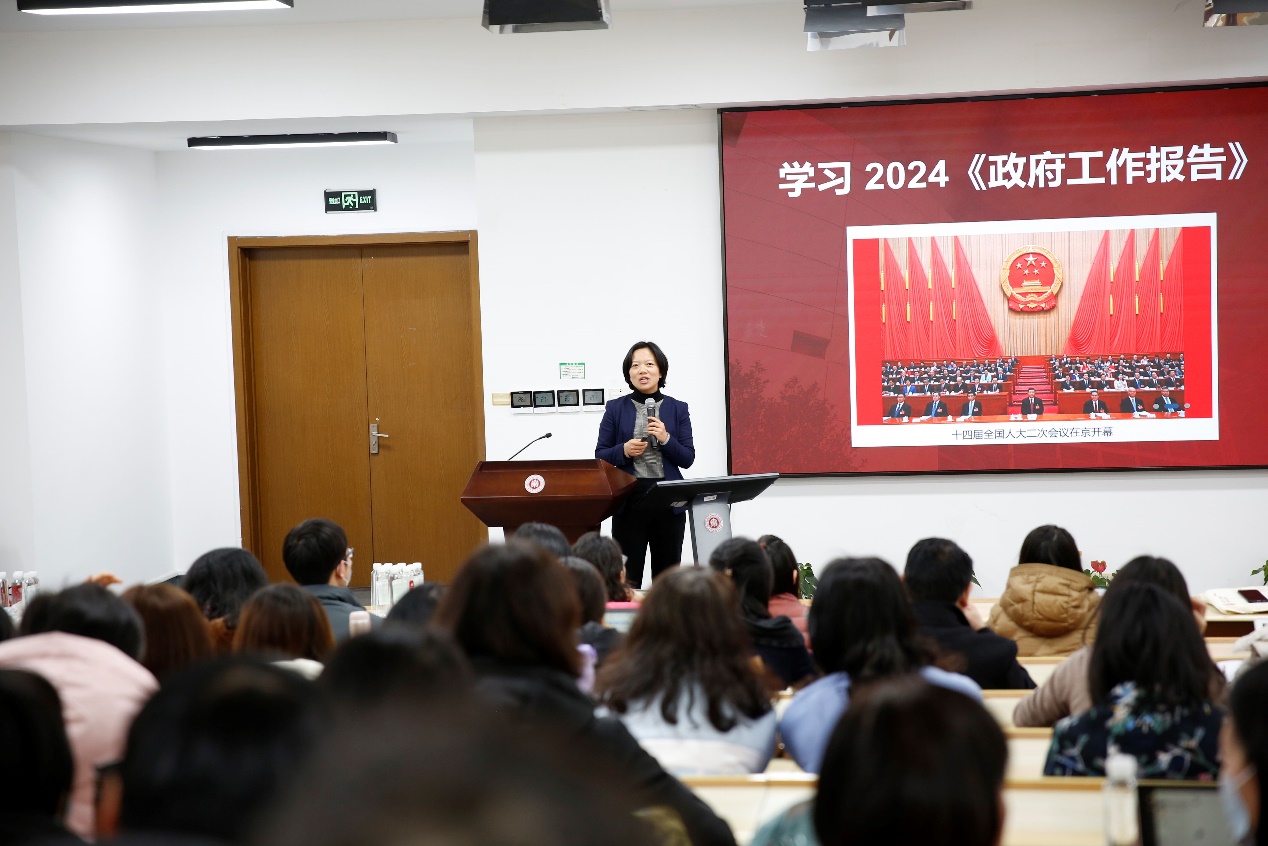 会议伊始,韩春红组织全体教师围绕全国“两会”精神开展教职工理论学习,对2024年政府工作报告内容进行解读。她提到,今年是中华人民共和国成立75周年,也是实现“十四五”规划目标任务的关键一年,学院各项工作要始终心怀国之大者、城之要者、校之重者,锚定目标、找准赛道,在对接服务中实现提升共创。