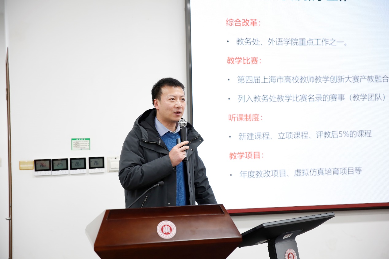 副院长赵朝永介绍了公共外语、学术研究、研究生培养、学科竞赛工作计划。他提出,学院将持续加大力度提升科研项目申报中标率,以五大研究团队为核心、以青年教师学术工作坊为阵地为教师提供集中性、针对性的科研辅导,希望各位老师能提升意识、紧跟节奏、配合申报进度,不断精进科研能力,为卓越学术建设贡献力量。