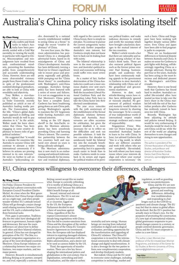 Walker's article reveals a fact that there are rationality and sagacity among scholars of Australia's think tanks. There are also eminent political figures such as the former prime minister Paul Keating, businesspeople, and academics who have been continuously making appeals to the government in Canberra to steer Australia's relationship with China out of the geopolitical and geo-economic maelstrom.