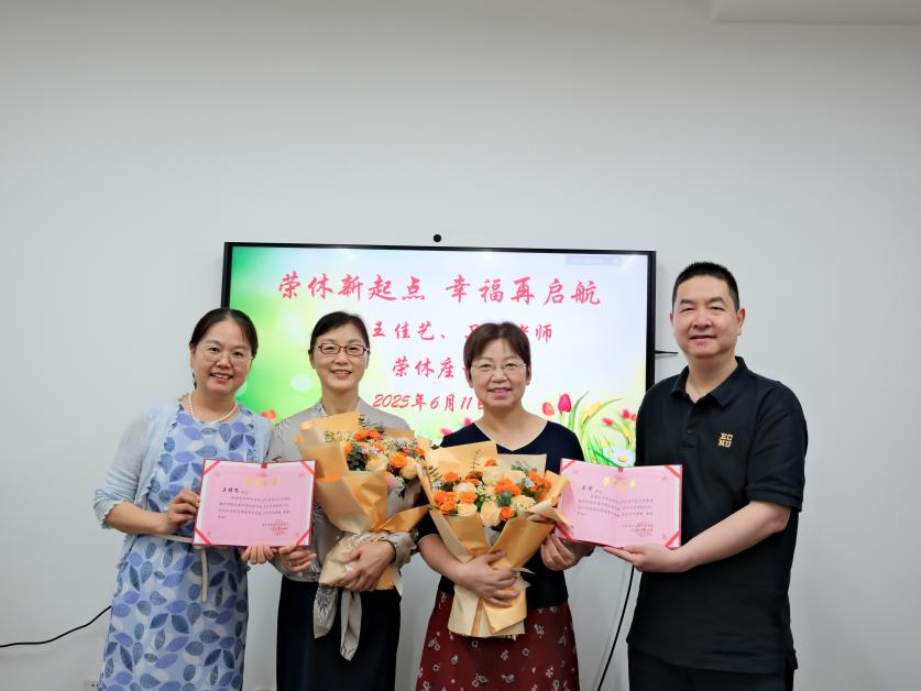 大学英语教学部主任严文庆代表整个教学部,向王佳艺、卫华老师献上最诚挚的祝福与感谢。他深情提及,大学英语教学部始终是一个充满友爱、融洽和谐的集体,这里的每一位教师都秉持着至真至诚的教育情怀,耕耘奉献。在热烈的掌声与欢快的氛围烘托下,苏俊玲和严文庆郑重地为王佳艺、卫华老师颁发荣休证书,衷心祝愿两位老师在未来的日子里,身体健康,生活顺遂如意,开启人生崭新的精彩篇章。