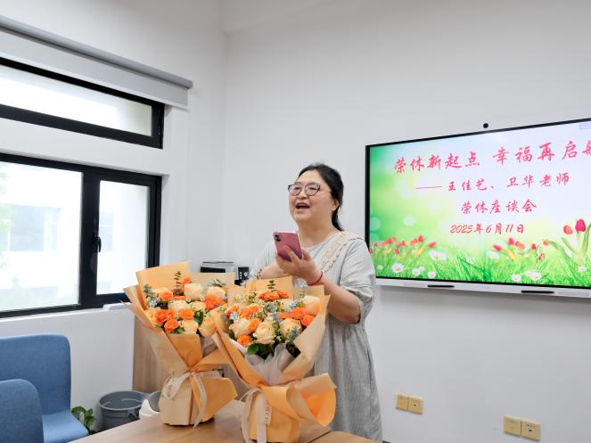 在这充满温情与敬意的氛围中,郭雯婷、杨佩桦回忆起与王佳艺、卫华老师共事的点点滴滴,那些或难忘、或有趣、或感动的瞬间,如同璀璨星辰,点缀着大家的职业生涯,也让两位老师的形象在大家心中愈发鲜活与立体。王佳艺、卫华老师也分别发表了荣休感言,她们满含深情地回顾了在华东师大的工作经历,对学院领导、同事以及学生们表达了深深的感激之情,同时也对大学英语教学部的未来发展送上了美好祝福。