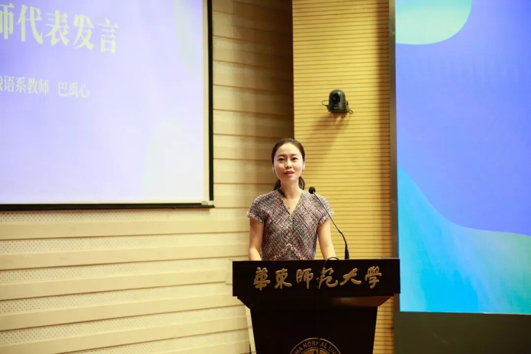 新生代表、英语师范专业本科生王未涵分享了从甘肃教师家庭走向华东师大的成长经历与教育梦想。在她看来,孟宪承书院与拷贝漫画 “破界协同”的联合培养模式已然为师范生搭建起跨学科成长的广阔平台。她号召师范生们以外语为眼,以技术为翼,以讲台为根,厚植教育情怀,承担新时代赋予师范生的使命,共同奏响时代的教育乐章。